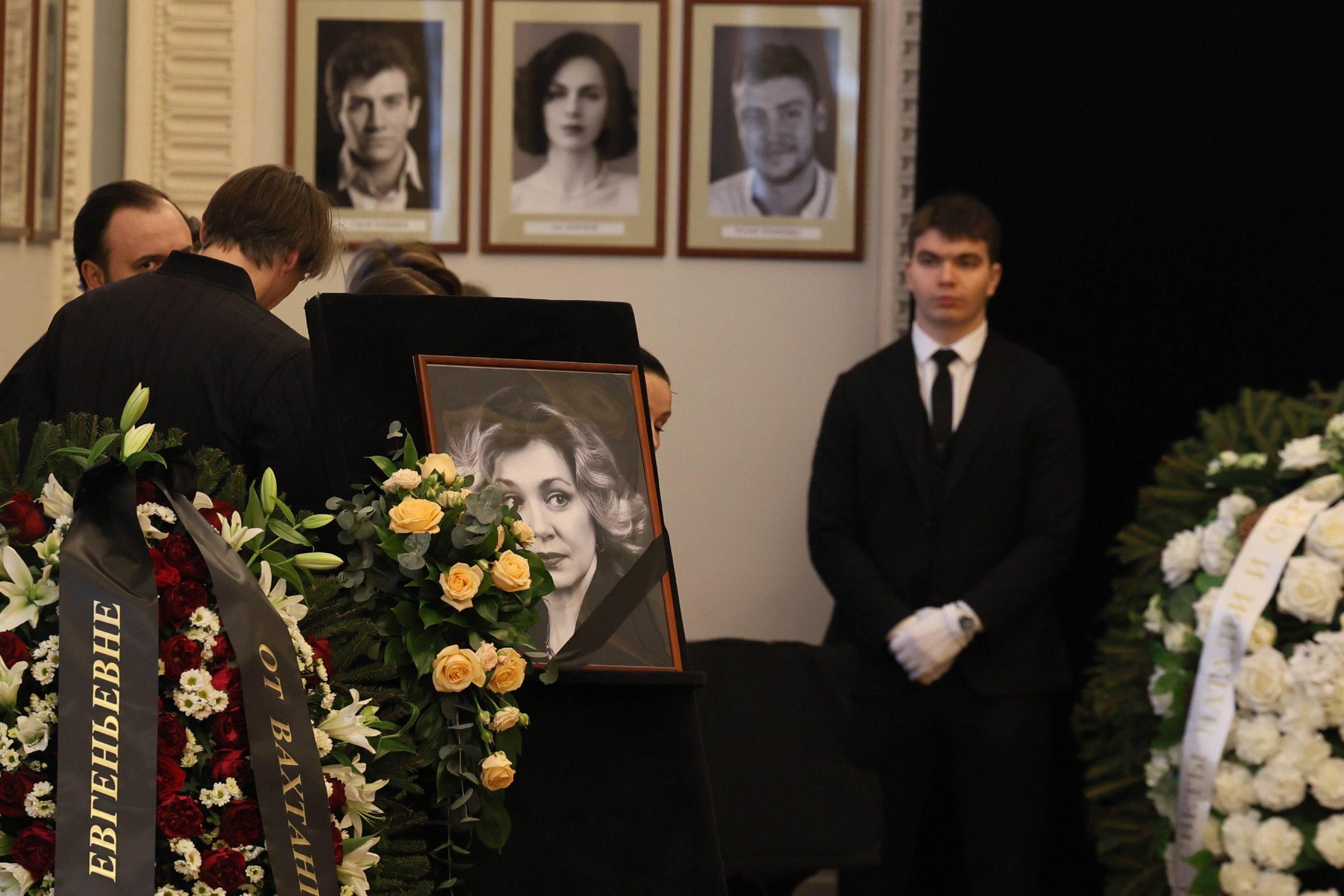 Спустя 15 минут после начала церемонии в зале находилось немного людей. Дочь актрисы, Анна, уединилась за стендом с портретом матери. Прощание проходит в фойе театра.