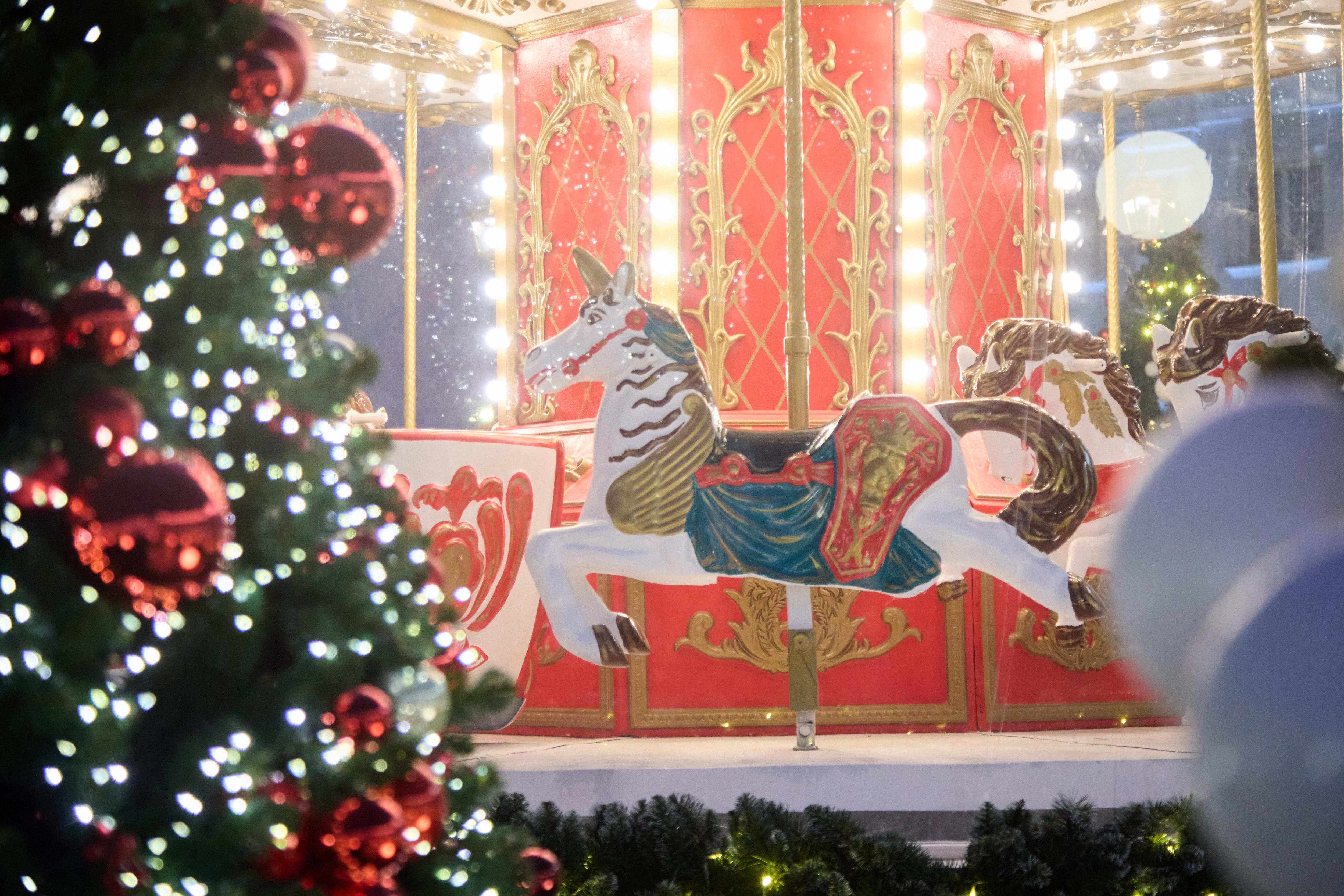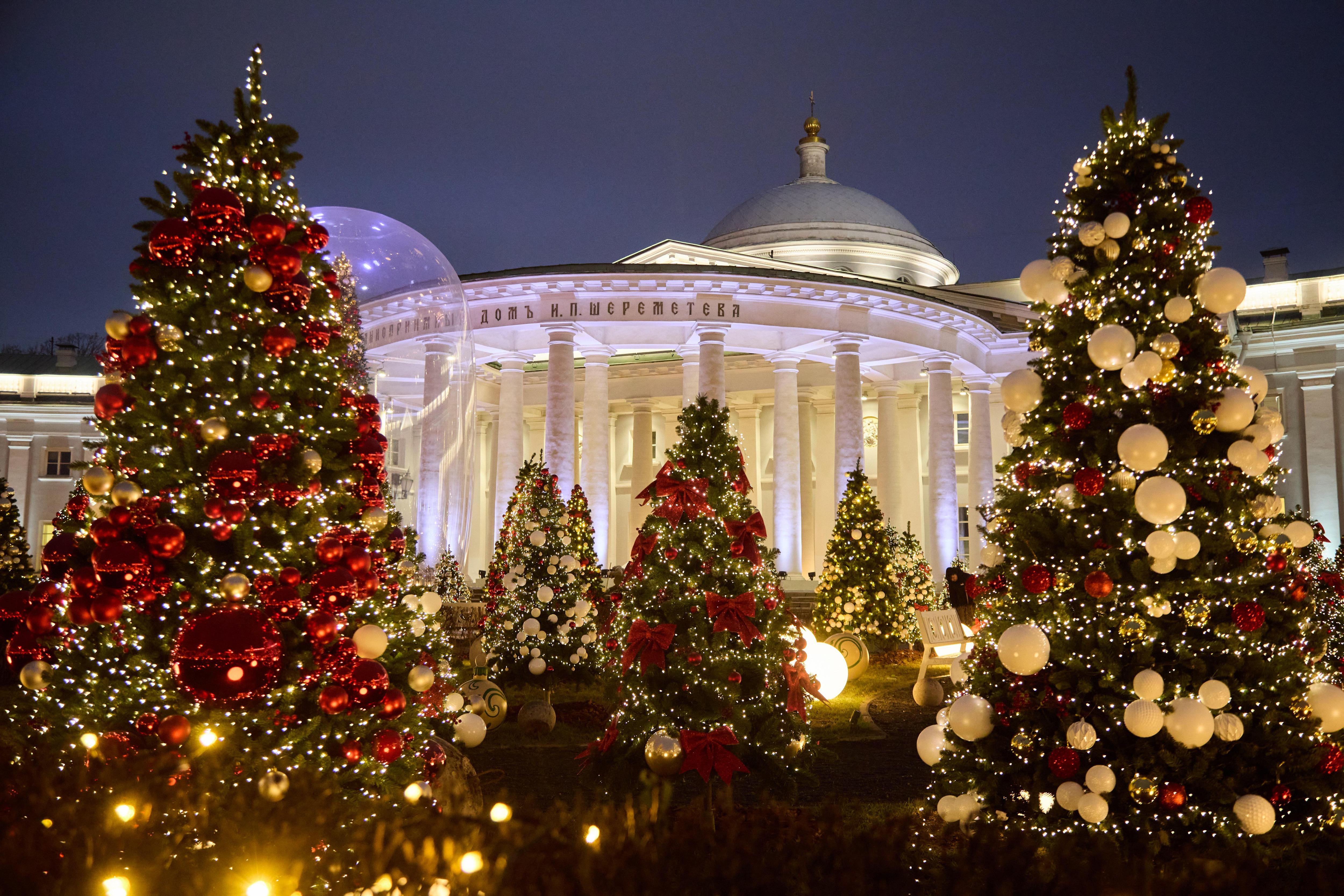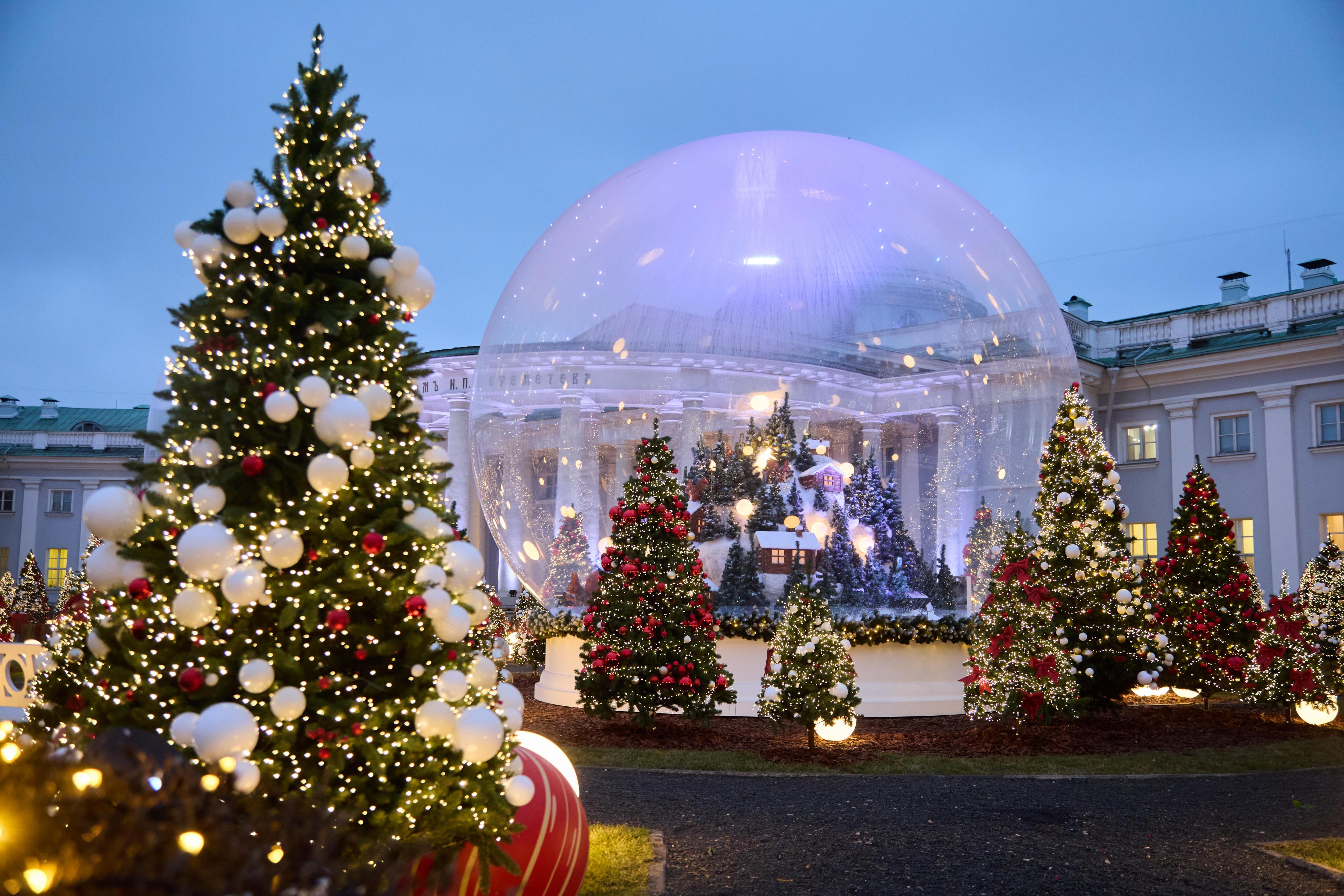 В саду НИИ скорой помощи имени Н.В. Склифосовского царит праздничная атмосфера. Здесь установили купольные инсталляции, внутри которых — карусели, домики и заснеженный лес. Кроме того, на территории поставили елки, украшенные яркими шарами и гирляндами.