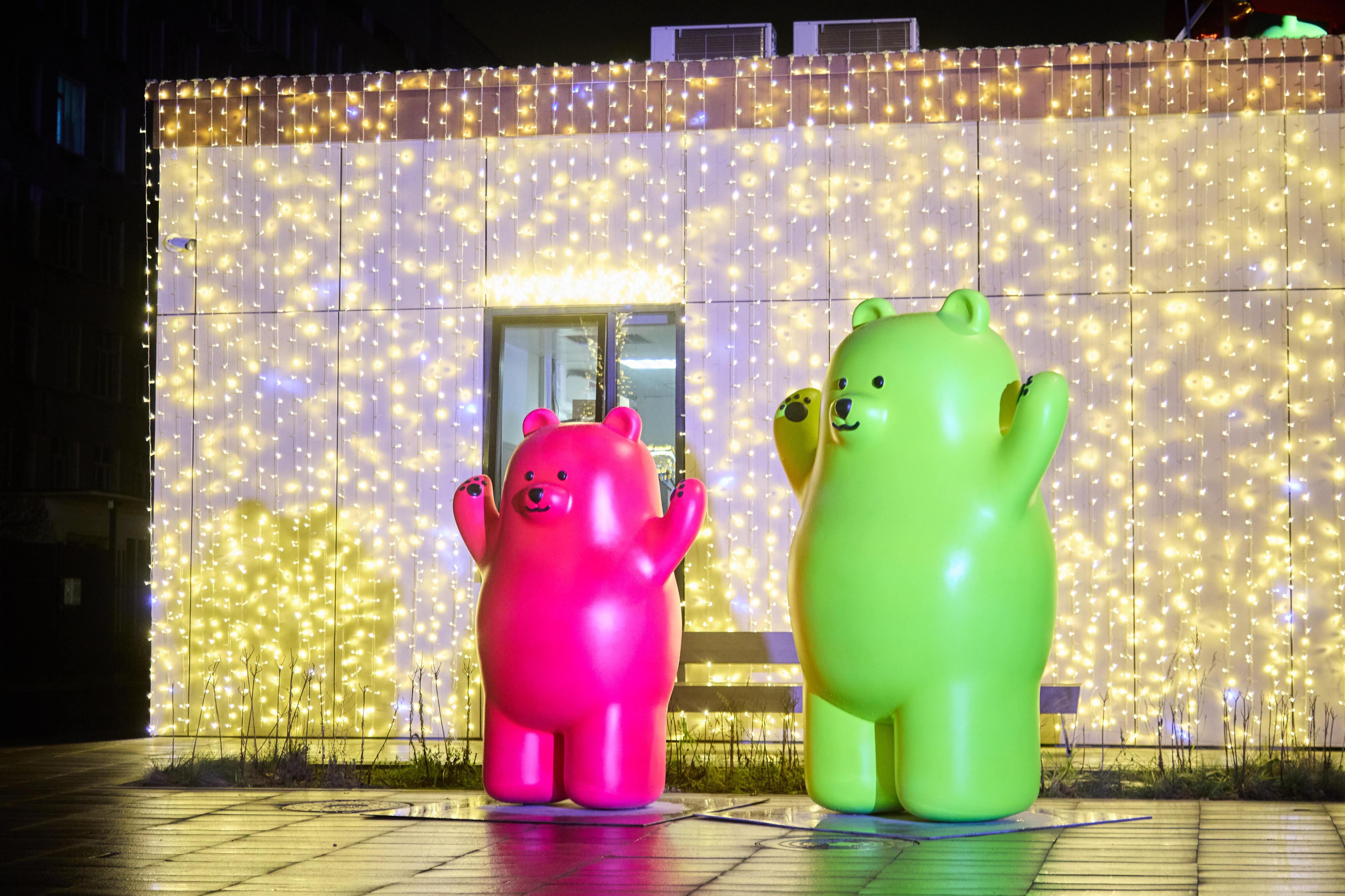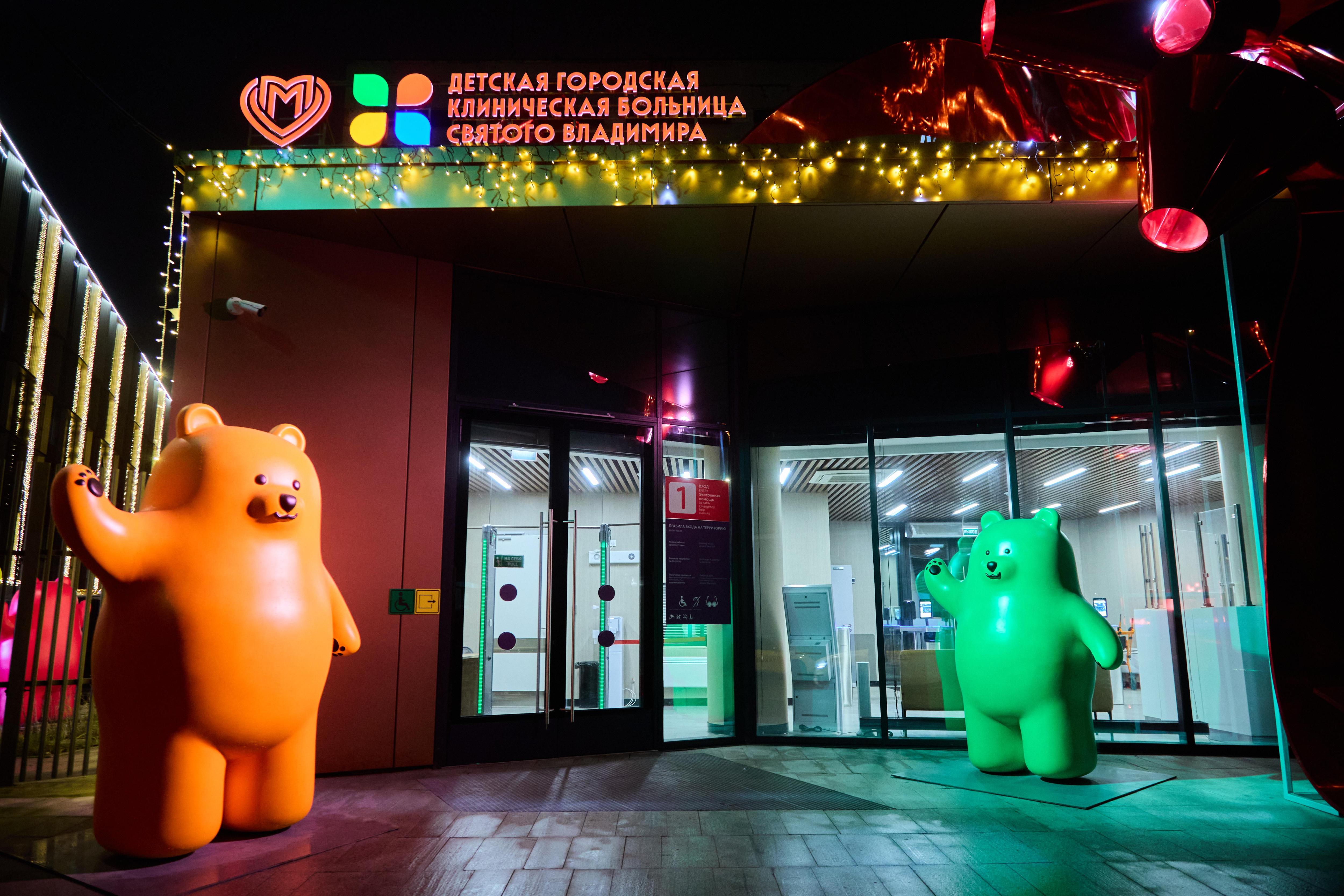 Новый комплекс больницы святого Владимира оформлен как новогодний подарок, перевязанный красной лентой. У входа и на территории установили пестрых мишек.