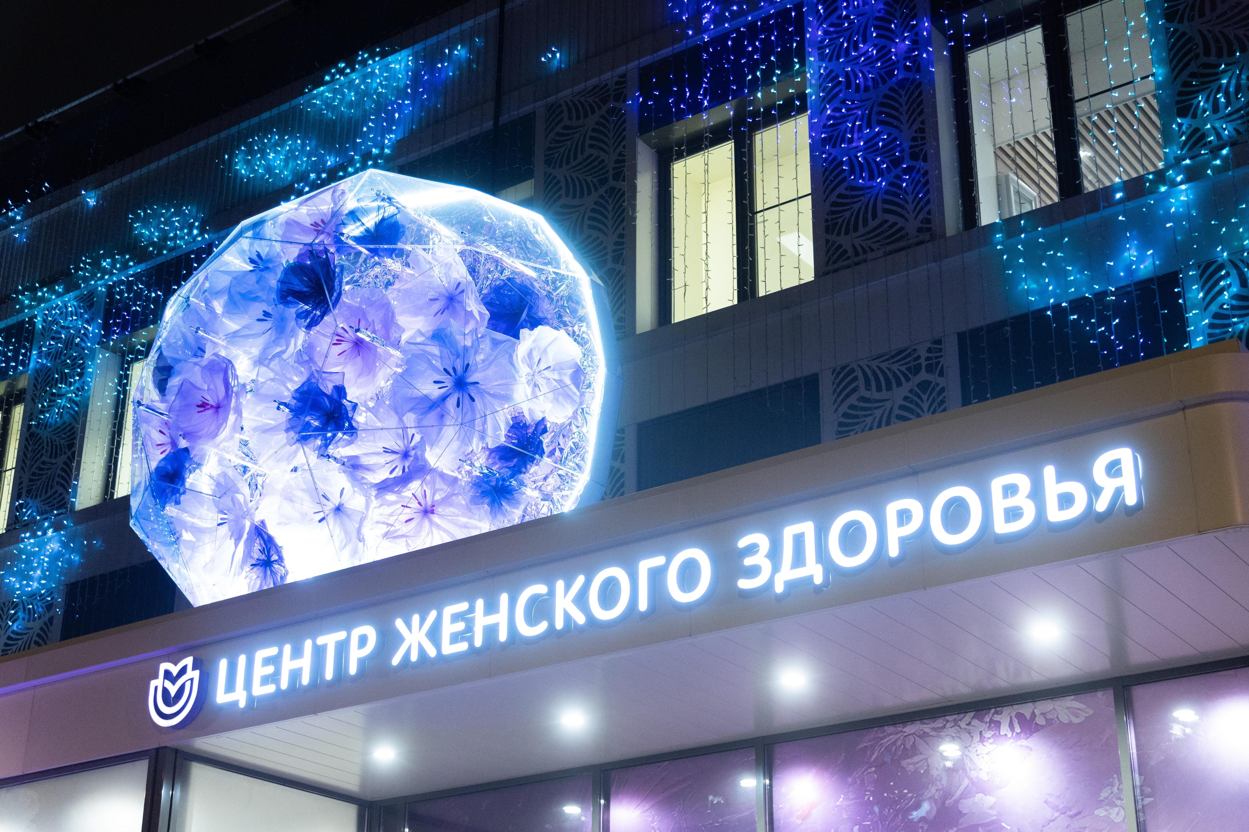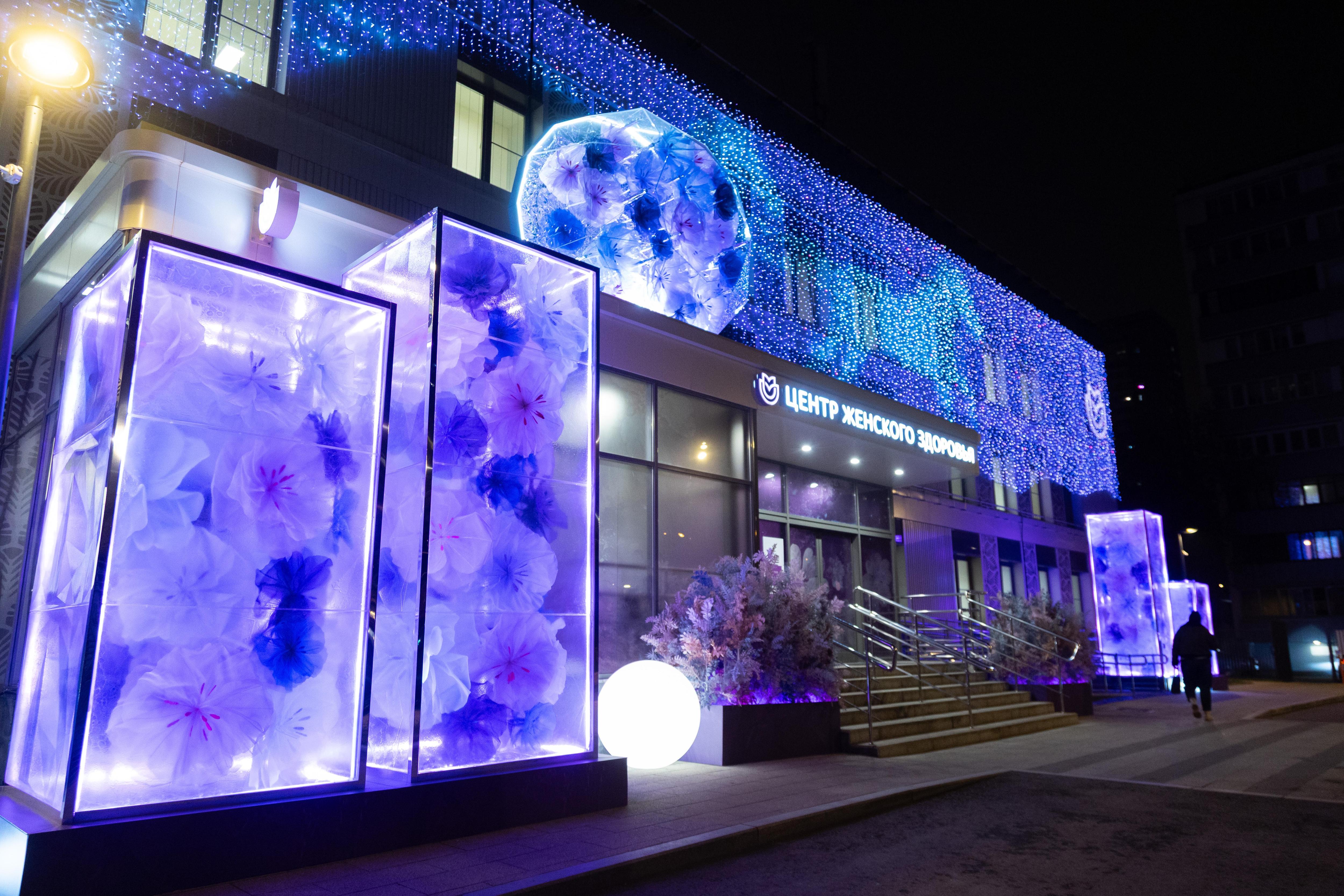 Центры женского здоровья также нарядили к празднику. Фасады украсили гирляндами с тематической анимацией, перед зданиями поставили большие ледяные скульптуры с подсвеченными замерзшими цветами внутри, а над входом разместили крупную сферу, похожую на бриллиант.