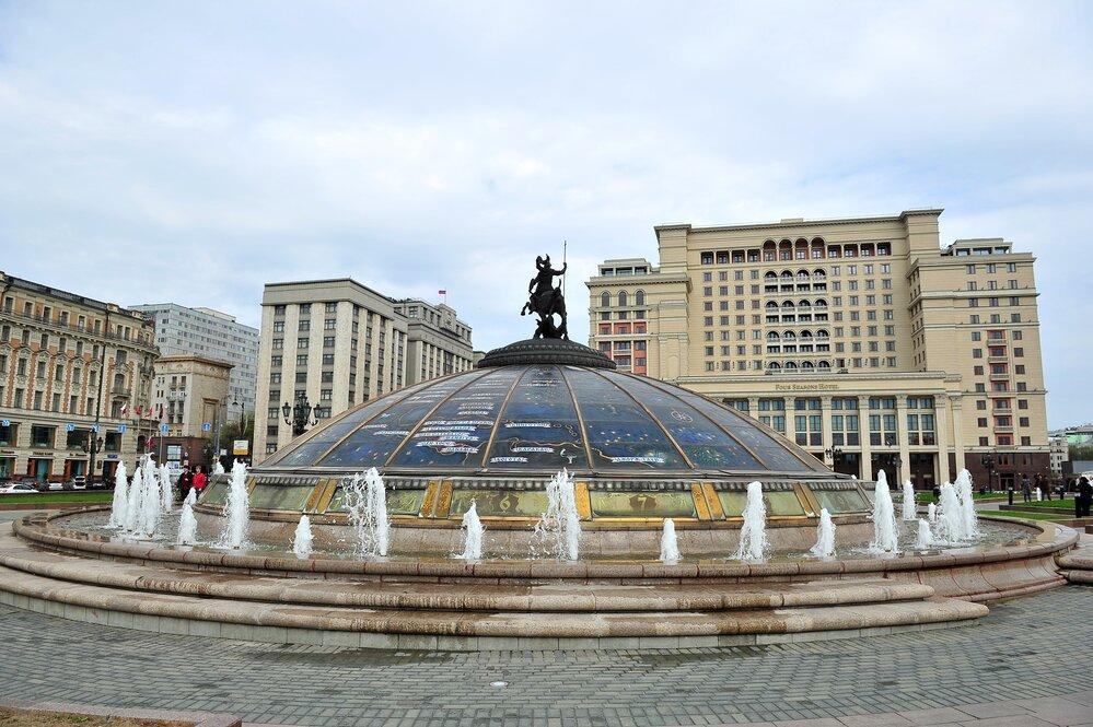 В центре Москвы на Манежной площади стартовал капитальный ремонт трёх фонтанов: «Часы мира», «Купола» и «Каскад».