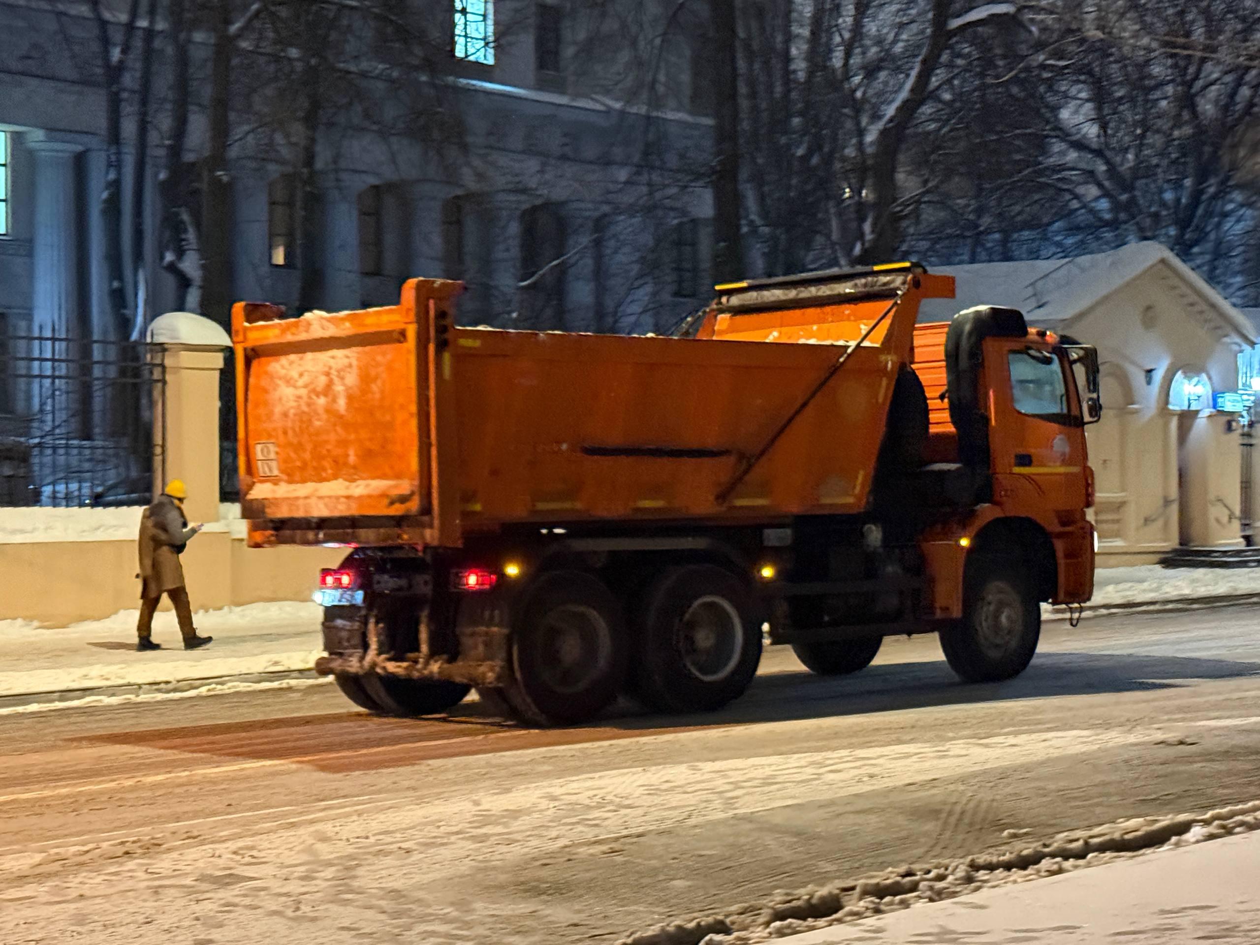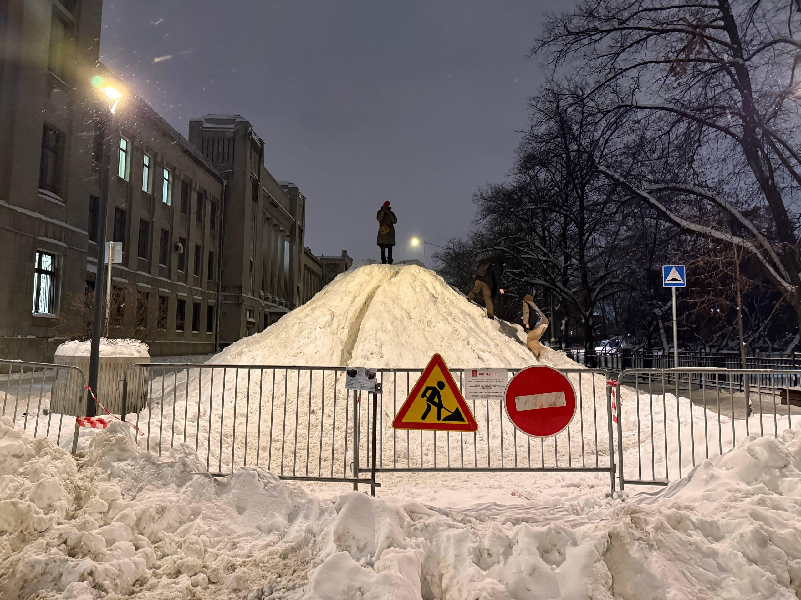 Сегодня доступ к большому сугробу на Миусской площади ограничили. Территорию огородили железными заборами, а за ними патрулирует полиция. На заднем плане заметна работа техники, которая разбирает снежную гору.
