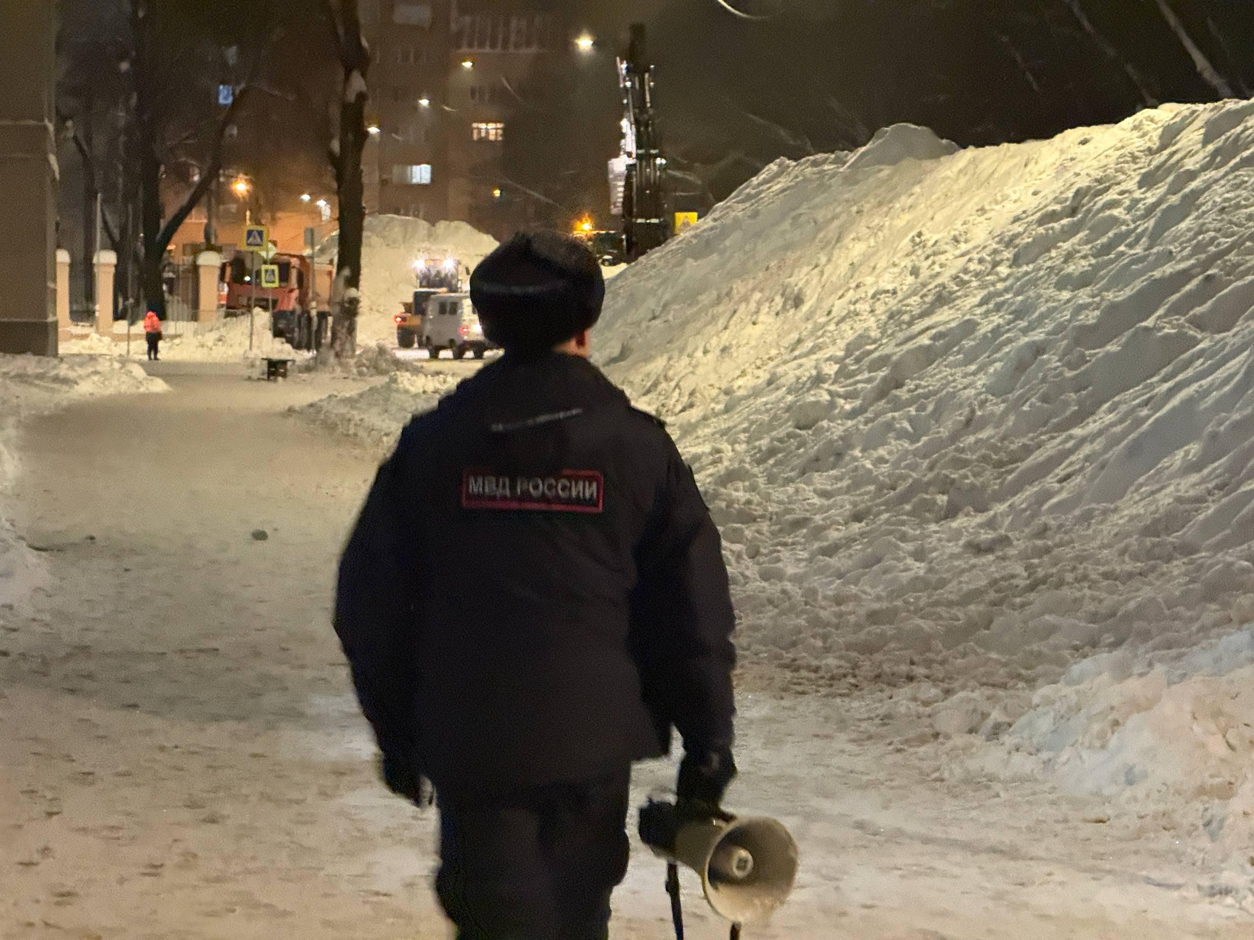 Возле большой снежной кучи дежурит полицейский, который патрулирует местность с громкоговорителем.