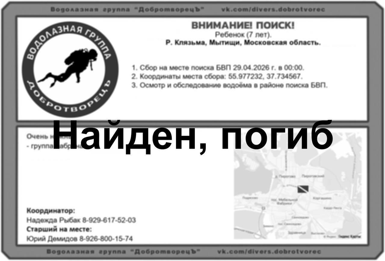 Вечером 28 апреля в Мытищах начались поиски 7-летнего мальчика, который ушел из дома. Через несколько часов его тело нашли в реке Клязьма. Об этом сообщили в водолазной группе «ДобротворецЪ».