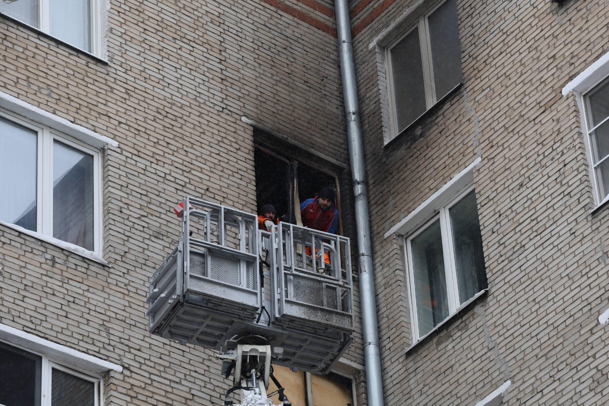 На месте происшествия продолжают работать сотрудники МЧС и коммунальных служб. К дому подали кран с люлькой, с помощью которого рабочие осматривают поврежденные квартиры. На фасаде видны следы копоти, некоторые окна уже забиты фанерой. При тушении в ряде помещений произошло залитие водой.