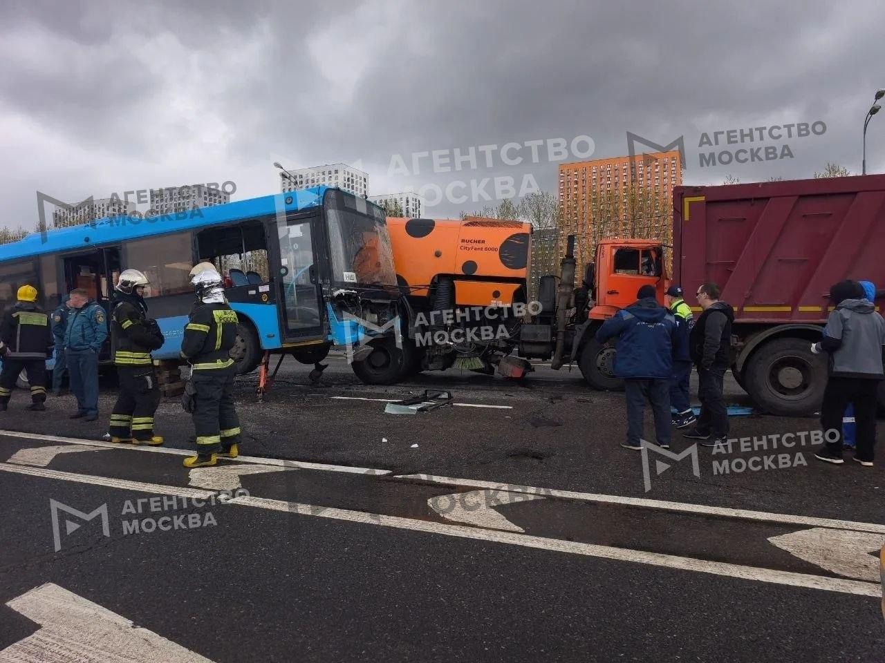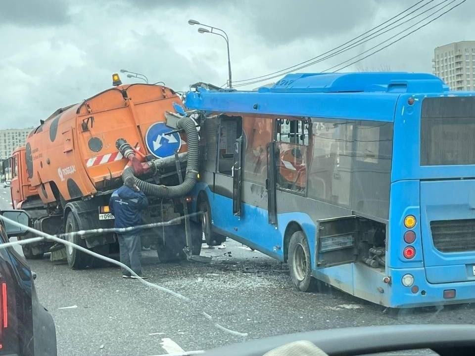 В результате удара у автобуса оказалась смята кабина водителя и разбиты стекла, передняя часть транспортного средства повисла в воздухе. В салоне находились семь человек. По предварительным данным, пострадали три человека: водитель и два пассажира. Все они с травмами различной степени тяжести доставлены в больницу. В МВД и «Мострансавто» подтвердили, что погибших нет.