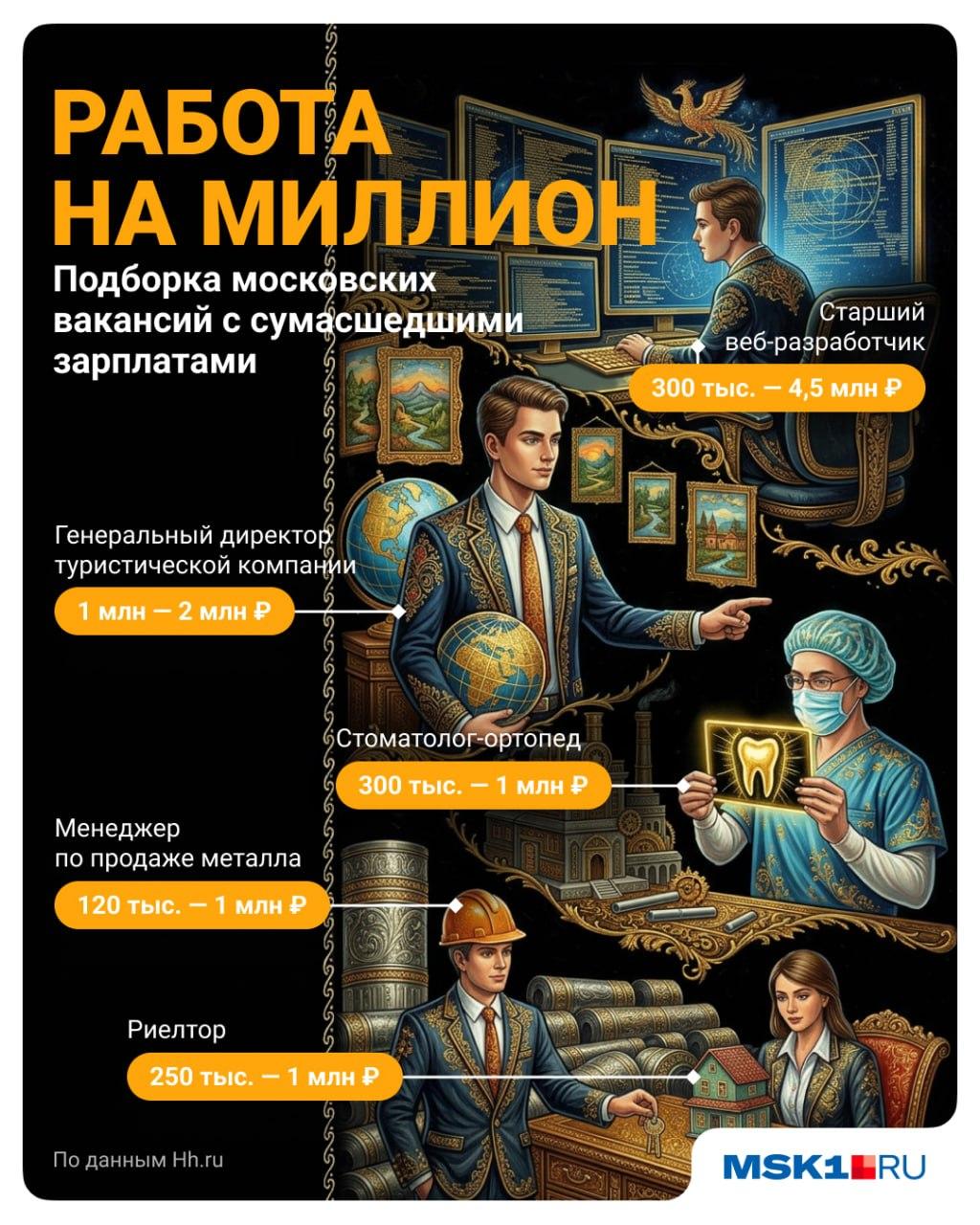 В Москве компании предлагают позиции, позволяющие получать заработок на уровне миллиона рублей. Среди них — риелторы, руководители в туризме и специалисты по продаже металлопроката.