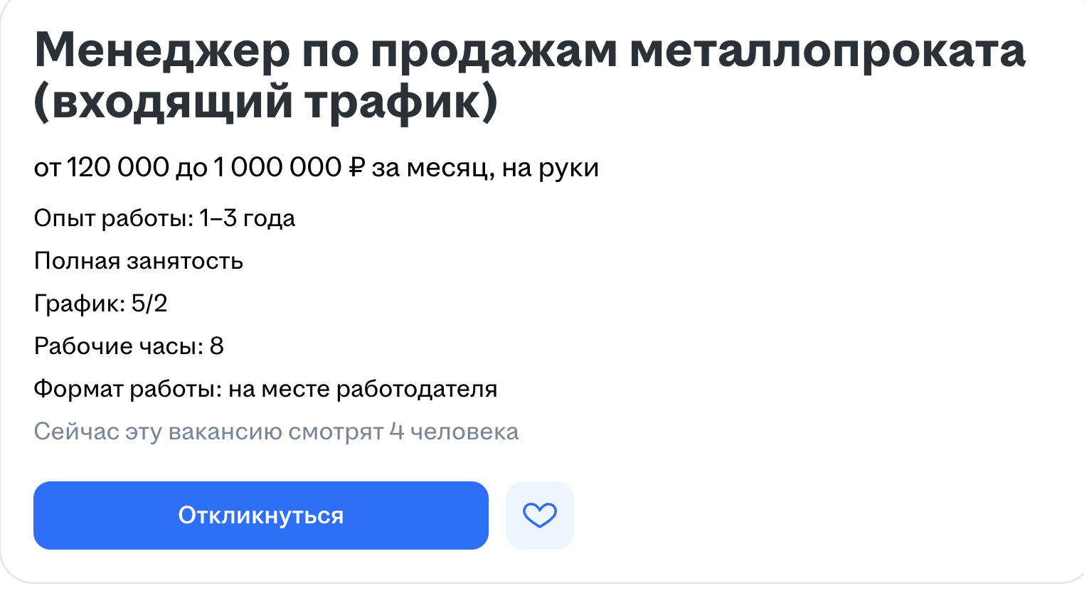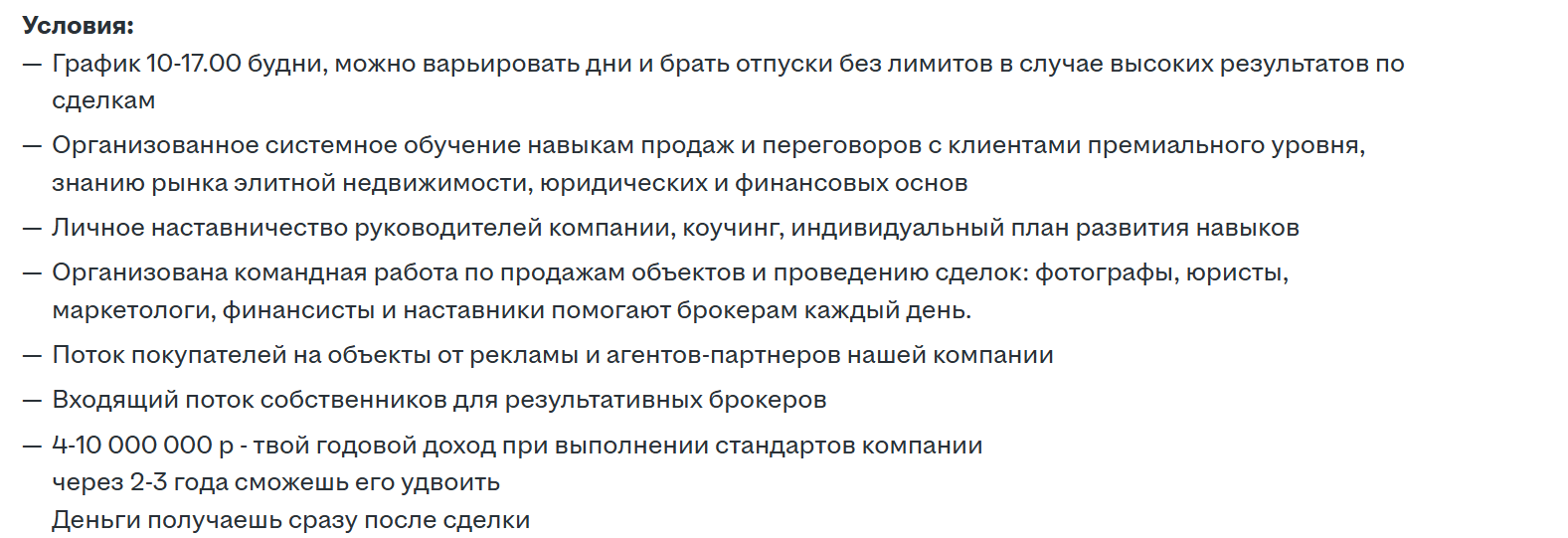 В объявлении указано: «Окладов нет — только % от сделок, поэтому такой уровень дохода и свободы. Первые сделки и деньги через 2-6 месяцев, зато потом стабильные результаты и доход не ограничен».