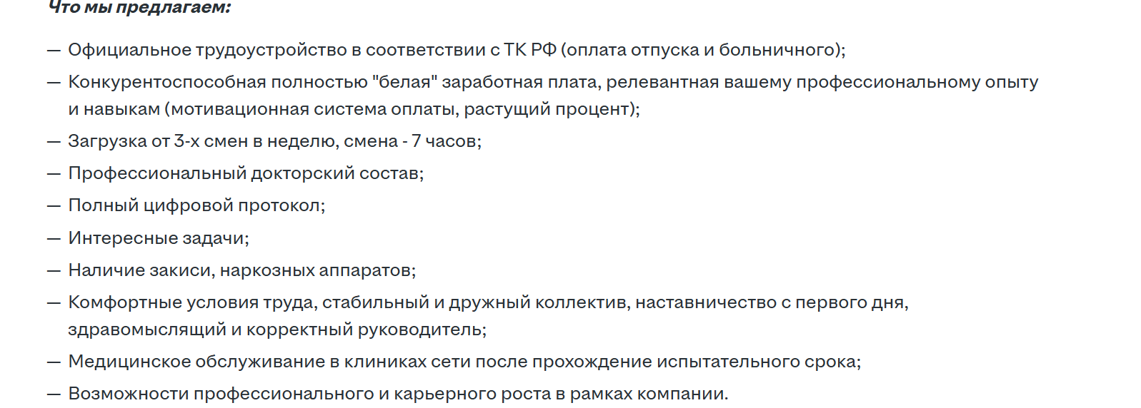Работодатель гарантирует официальное трудоустройство в соответствии с Трудовым кодексом, белую зарплату, медицинское обслуживание после испытательного срока и другие льготы.