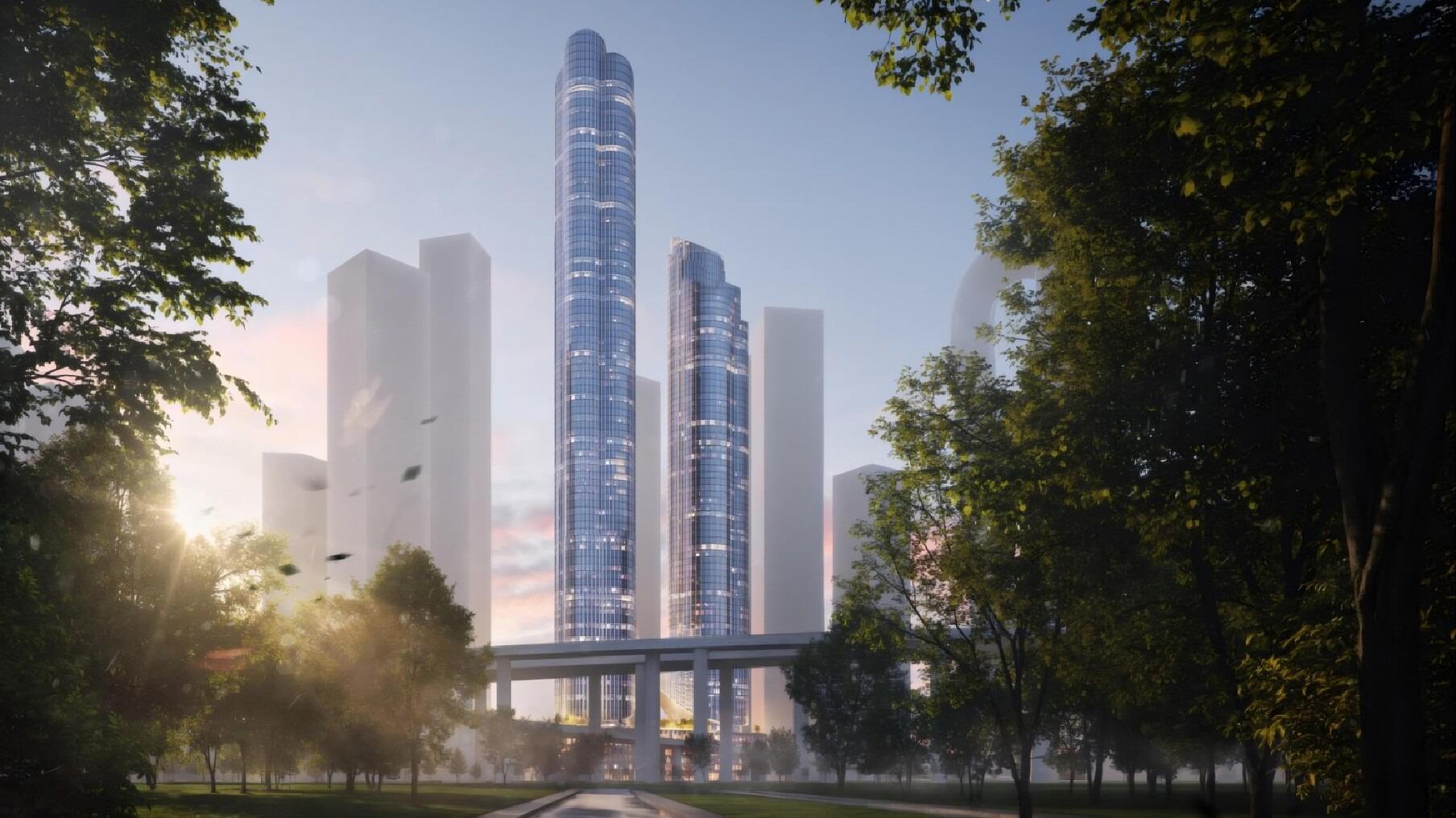 Две высотные башни будут соединены многоуровневым стилобатом.