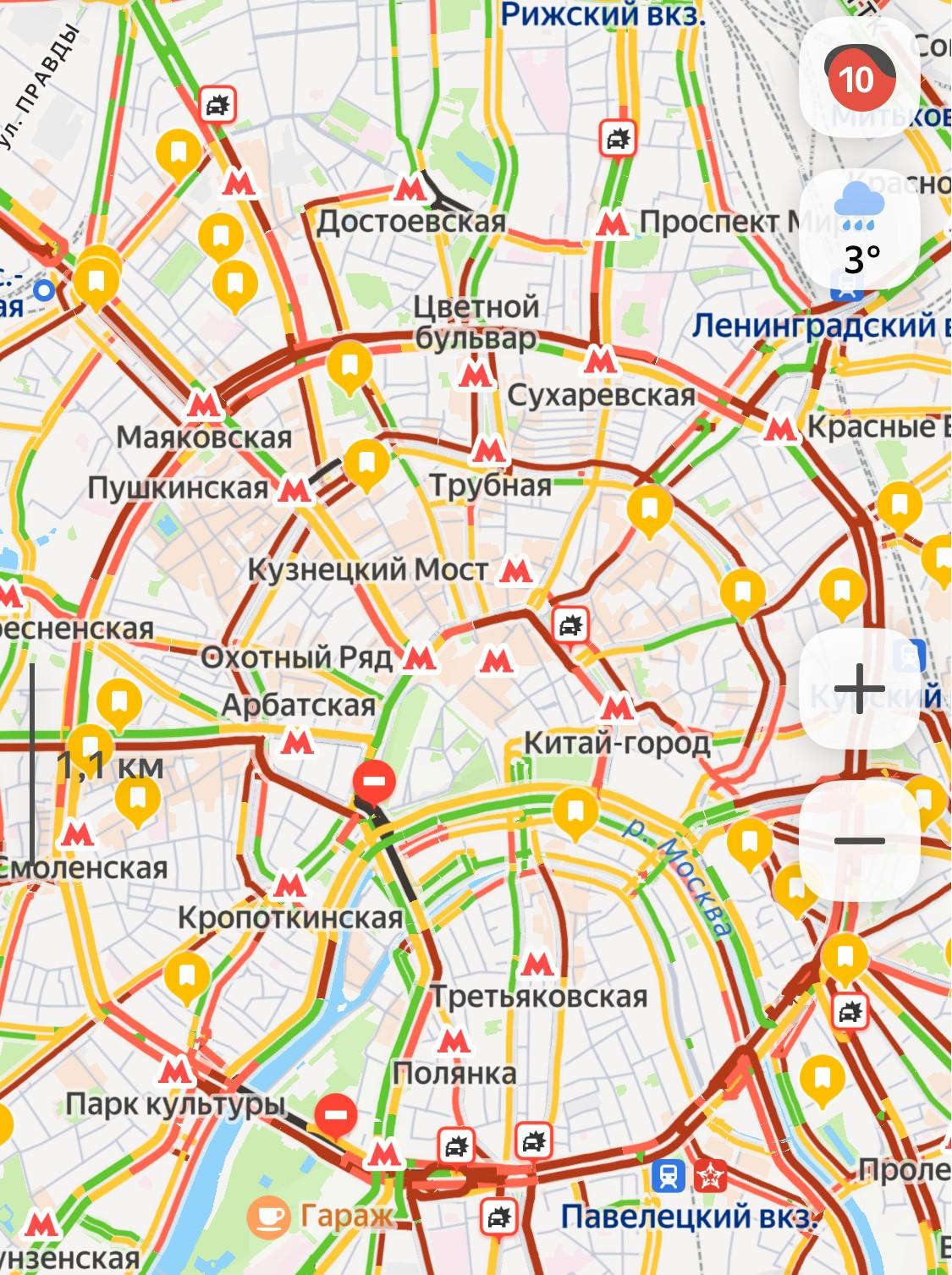 Дорожная ситуация в Москве ухудшилась до 10 баллов, движение практически остановилось. Перекрытия организованы на Садовом кольце в районе улицы Крымский Вал, а также на внешней стороне кольца у Земляного Вала.