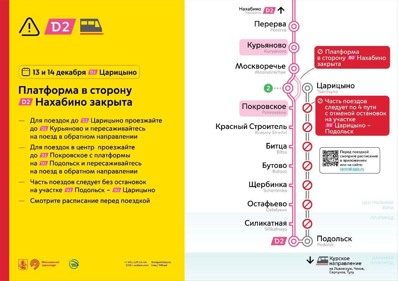 Движение электричек в направлении области, к Подольску, останется без изменений и будет включать остановку на станции Царицыно.
