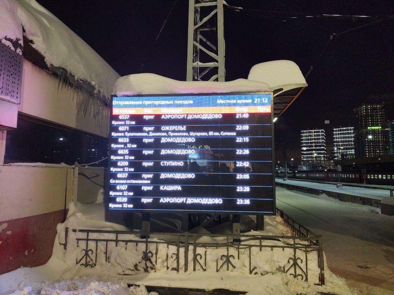 Другой читатель отправился на станцию в районе Дербеневской около 20:00, но не смог уехать ни в 20, ни в 21 час. На Павелецком вокзале он обнаружил, что поезд исчез с табло без какого-либо уведомления. «Сначала поезд должен был прибыть 10 минут, как — но так и не приехал. А когда я поехал на вокзал, чтобы сесть на 21:17 на поезд, то он просто пропал из табло, даже без надписи «отмена». Сам вокзал полупустой. То есть электрички в расписании есть — на деле — их нет», — поделился он.