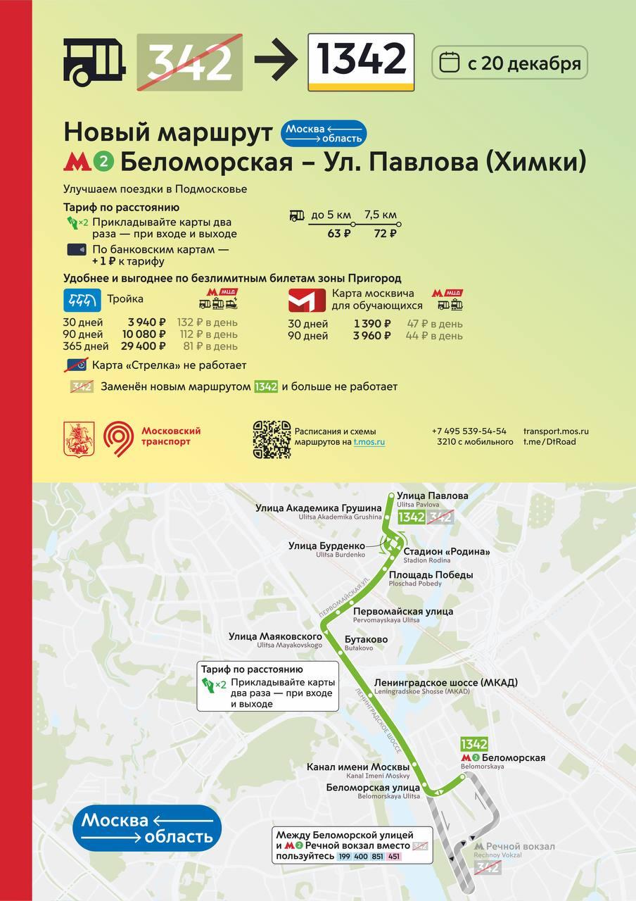 Маршрут №1342 соединит станцию метро «Беломорская» с улицей Павлова в Химках. Автобусы проследуют по Ленинградскому шоссе и Первомайской улице, сделав остановку у стадиона «Родина». Тарифы на проезд варьируются в зависимости от дистанции: поездка до 5 км обойдется в 63 рубля по «Тройке», а до 7,5 км — в 72 рубля.