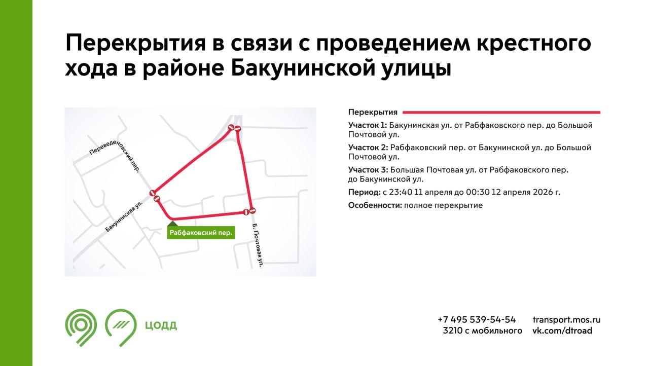 Кроме того, с 23:40 11 апреля до 00:30 12 апреля для проезда перекроют Рабфаковский переулок, а также участки Бакунинской и Большой Почтовой улиц.