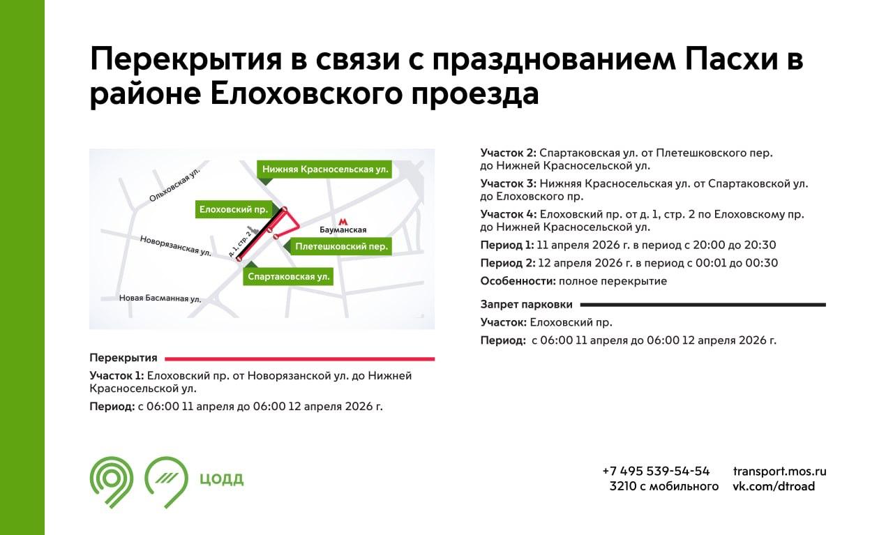 Елоховский проезд будет полностью закрыт для движения с 06:00 11 апреля до 06:00 12 апреля в связи с празднованием Пасхи. На этом участке одновременно запретят и парковку.