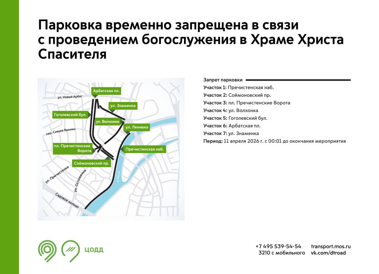 С 00:01 11 апреля и до окончания богослужения будет временно запрещена парковка на Пречистенской набережной, в Соймоновском проезде, на улицах Волхонке и Знаменке, Гоголевском бульваре, а также на площадях Пречистенские Ворота и Арбатская.
