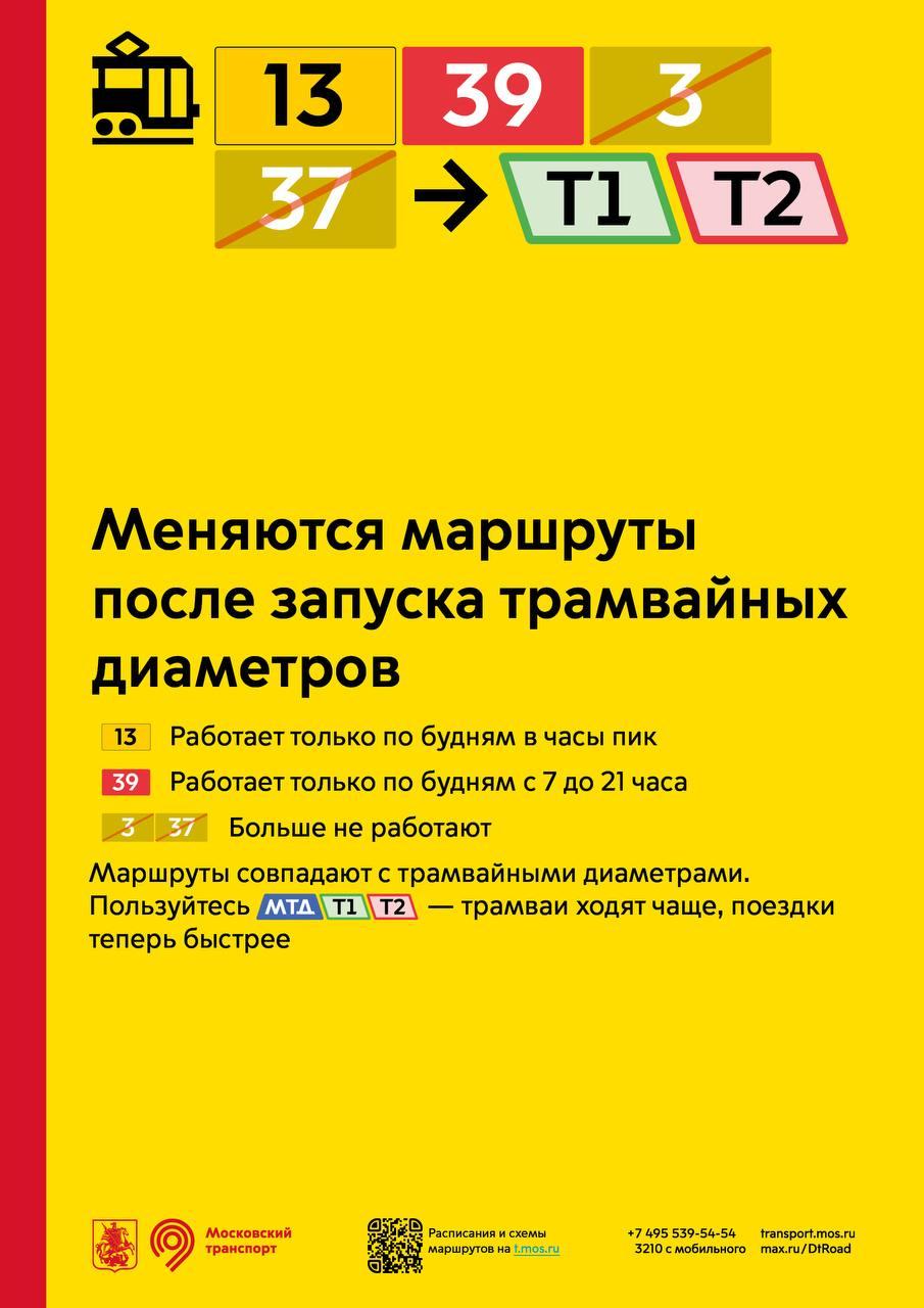 В связи с этим событием столичный департамент транспорта скорректировал трамвайные маршруты, дублирующие пути следования диаметров Т1 и Т2. Изменения вступили в силу 10 апреля.