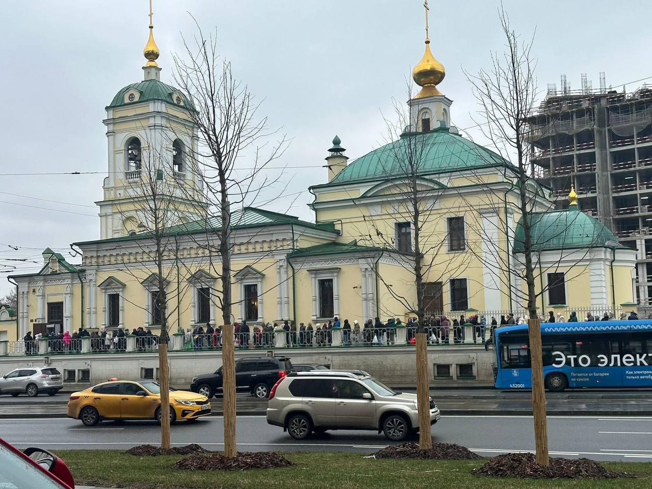 Верующие стоят в очереди у входа в храм Преображения Господня в Преображенском.